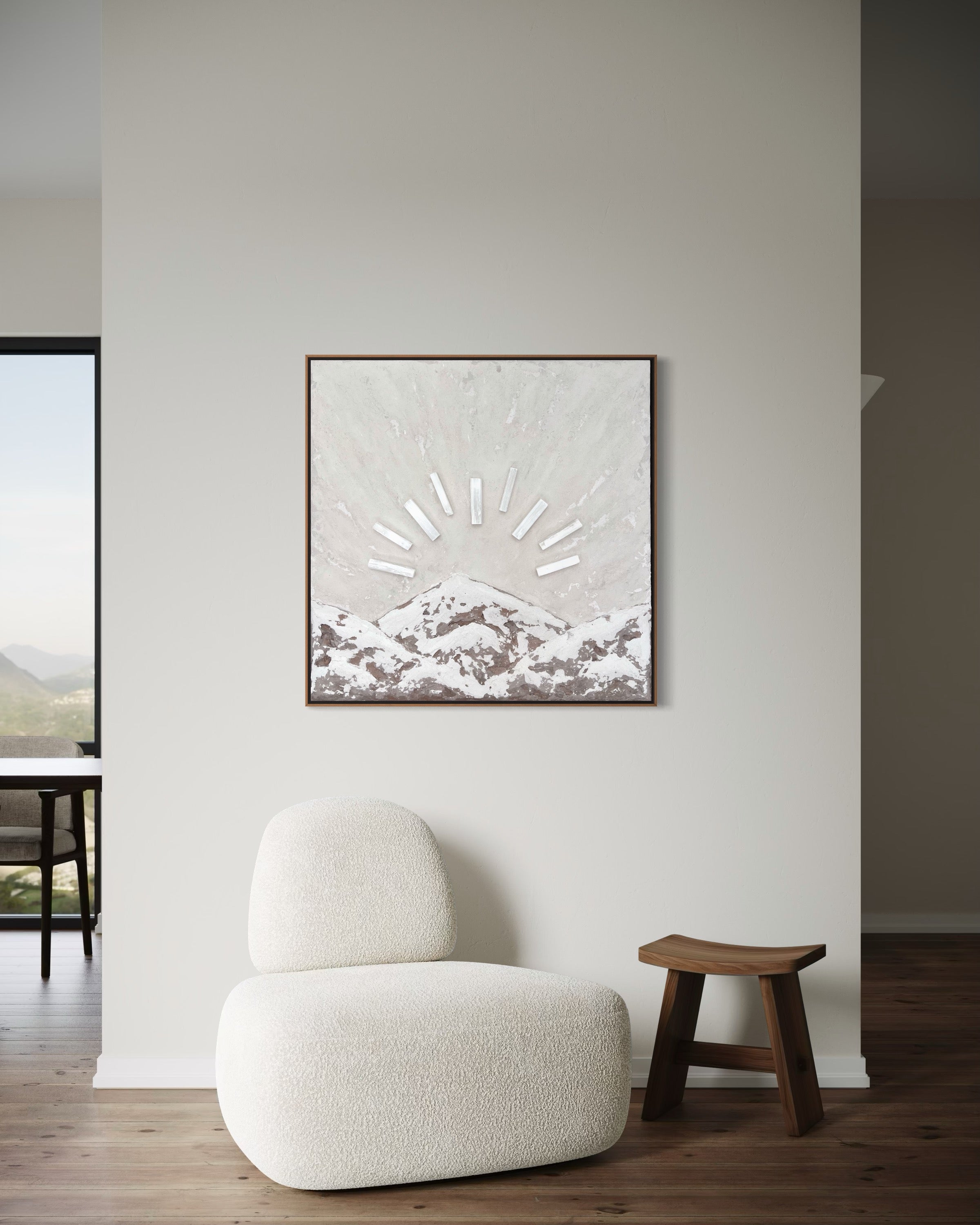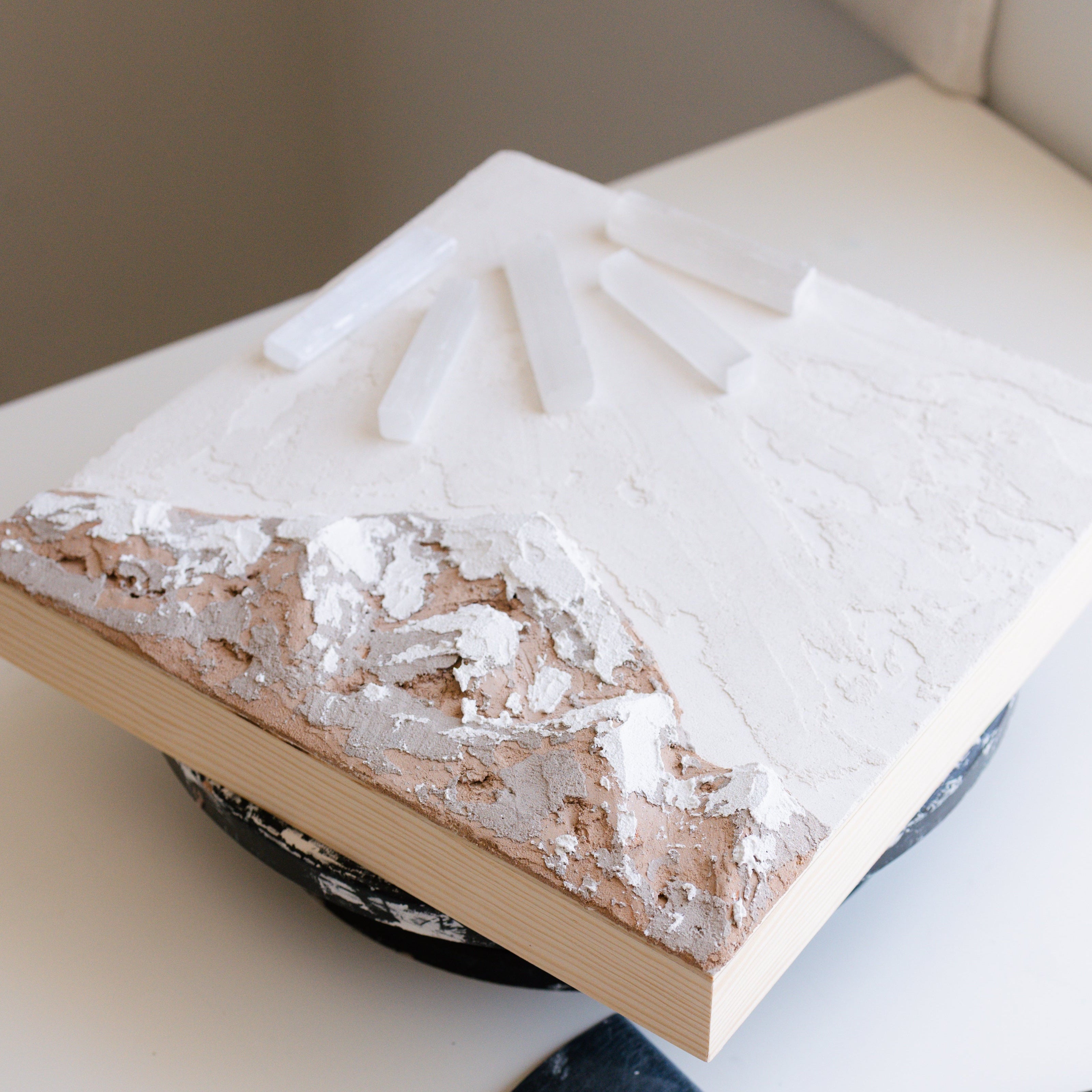 Selenite crystals are central to her work—chosen for their purifying, energy-cleansing properties and their unique ability to reflect and diffuse light. Their luminous presence reinforces the spiritual intention embedded in each piece.