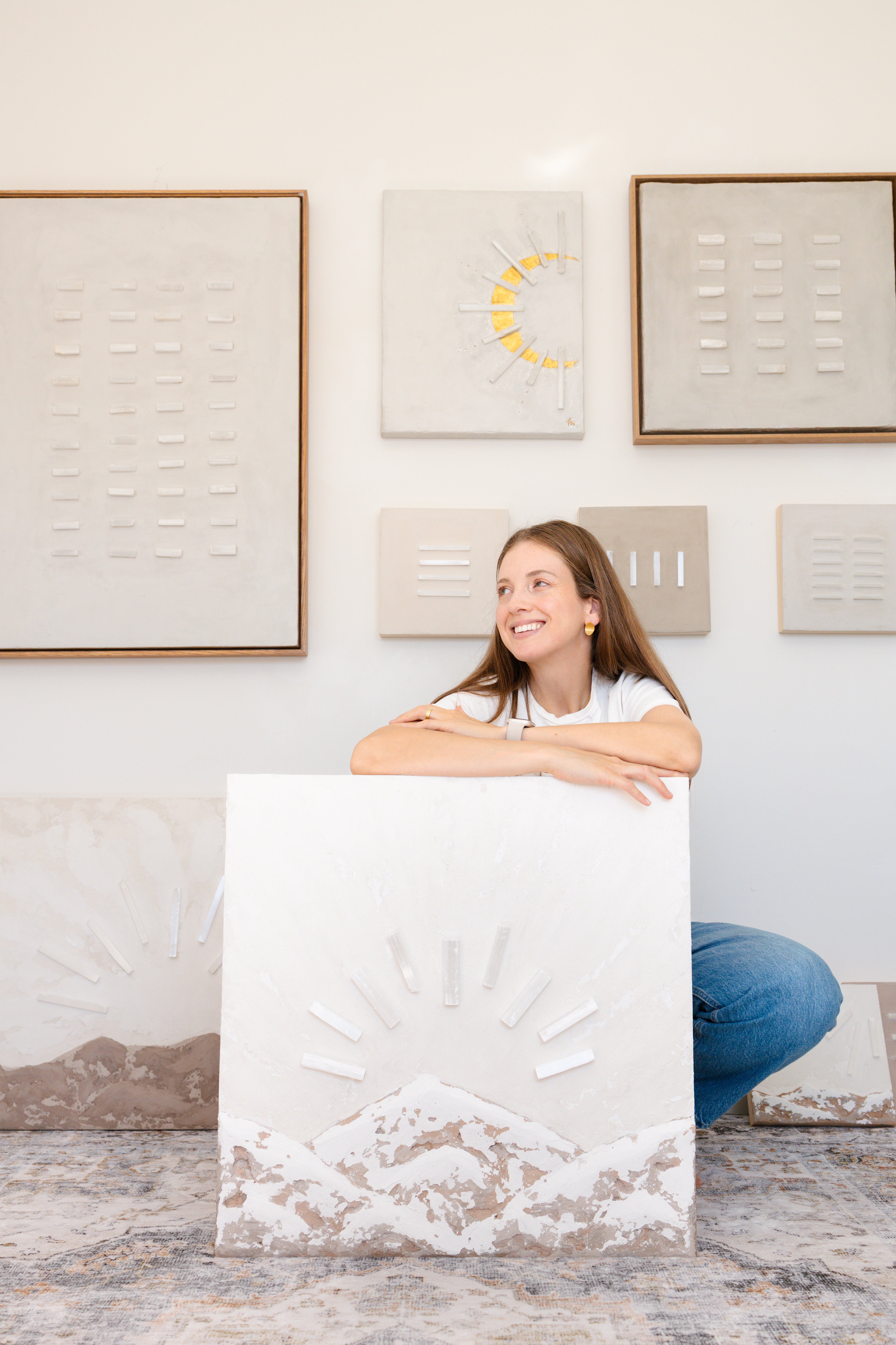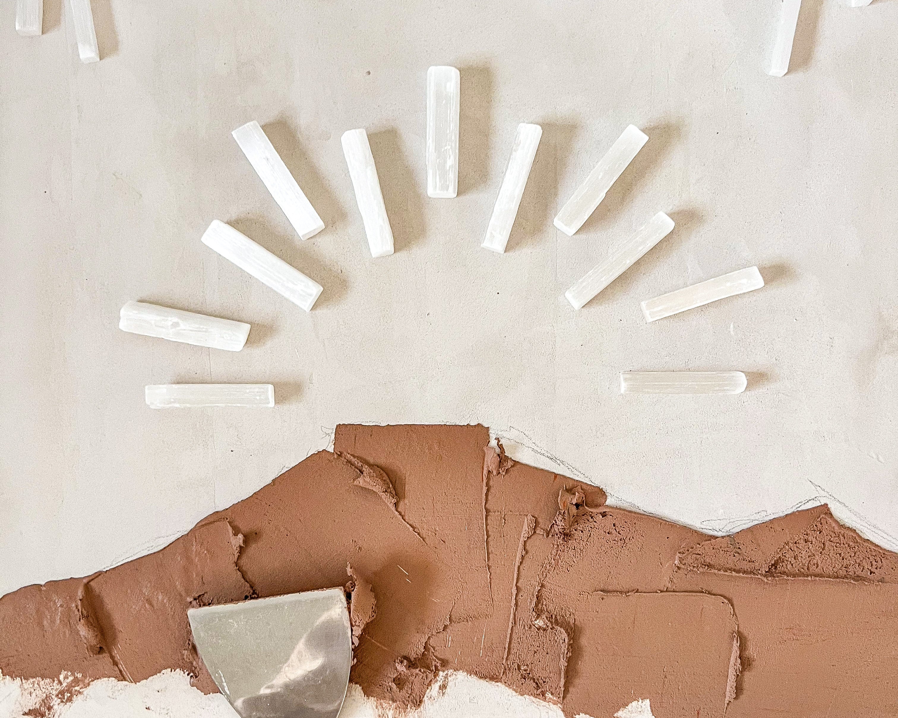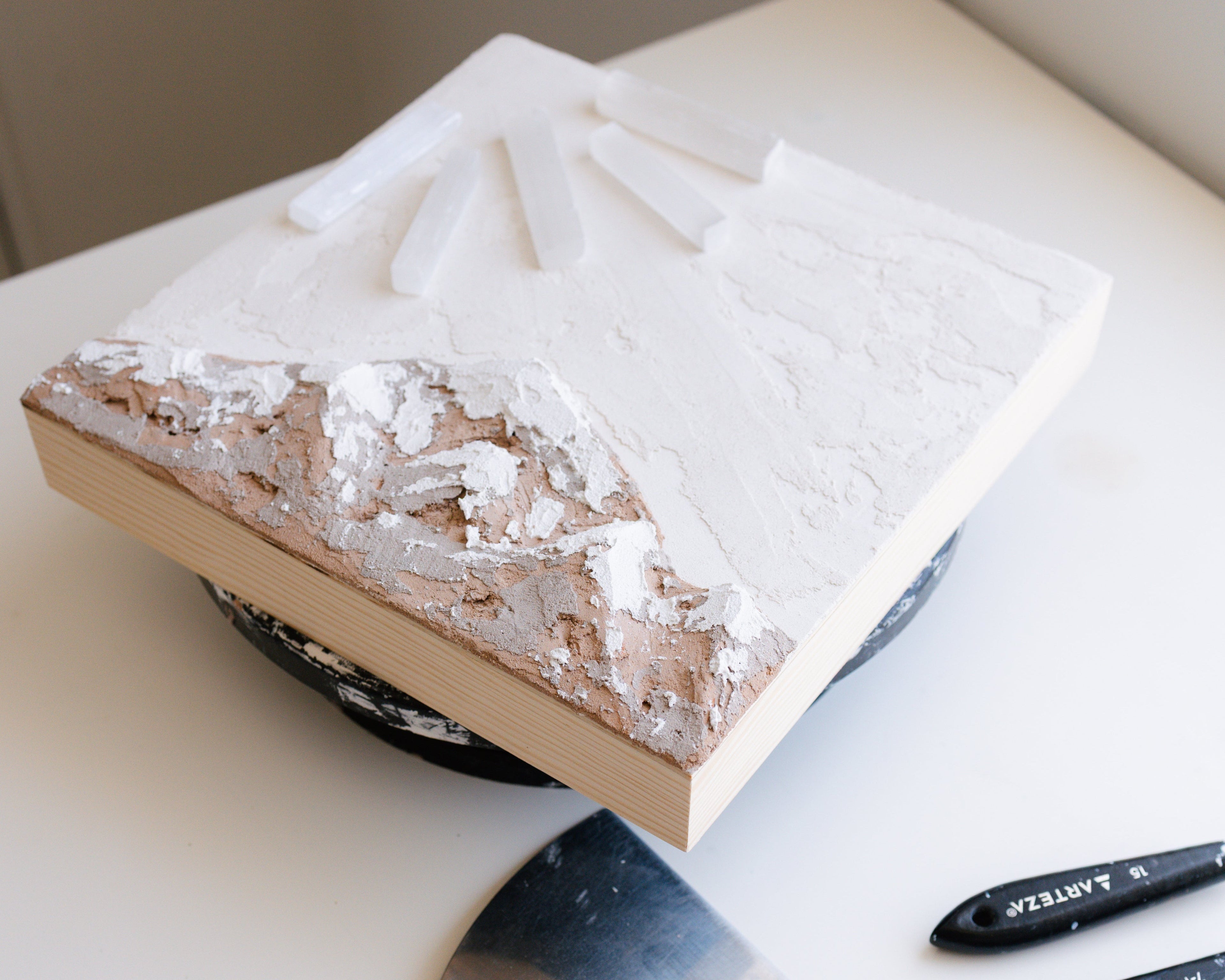 Inspired by my background in architecture, I approach each piece as both structure and spirit. Texture becomes a language of memory; earth pigments recall landscapes of belonging; selenite crystals embody clarity, alignment, and the luminous essence of consciousness. Through slow layering and intentional placement, the work becomes a meditation — a process of revealing, grounding, and refining.