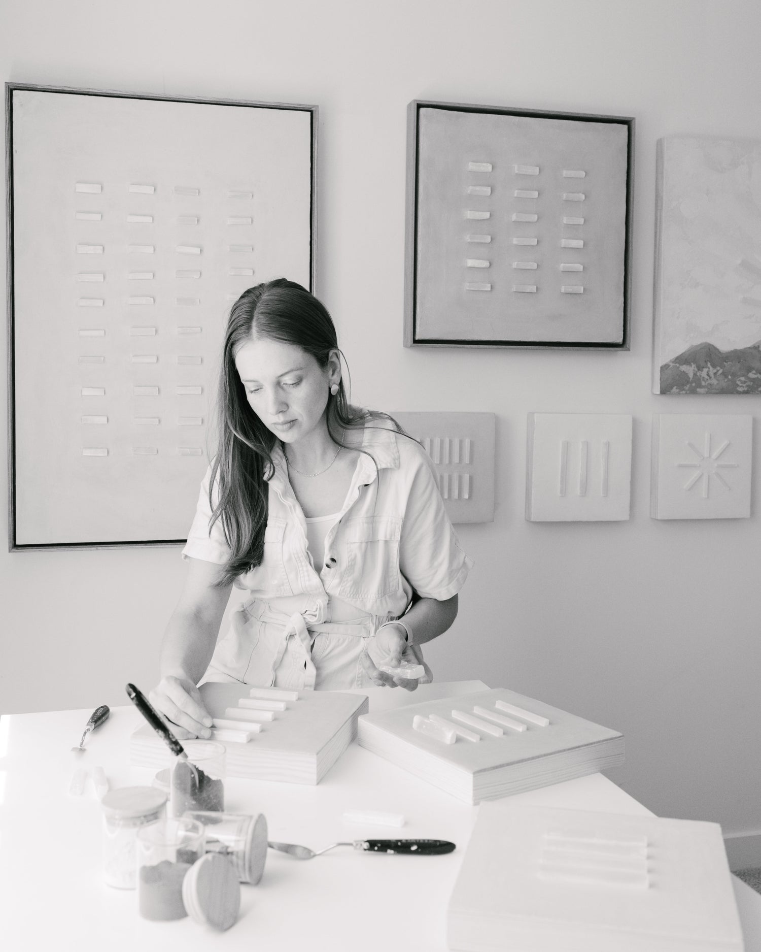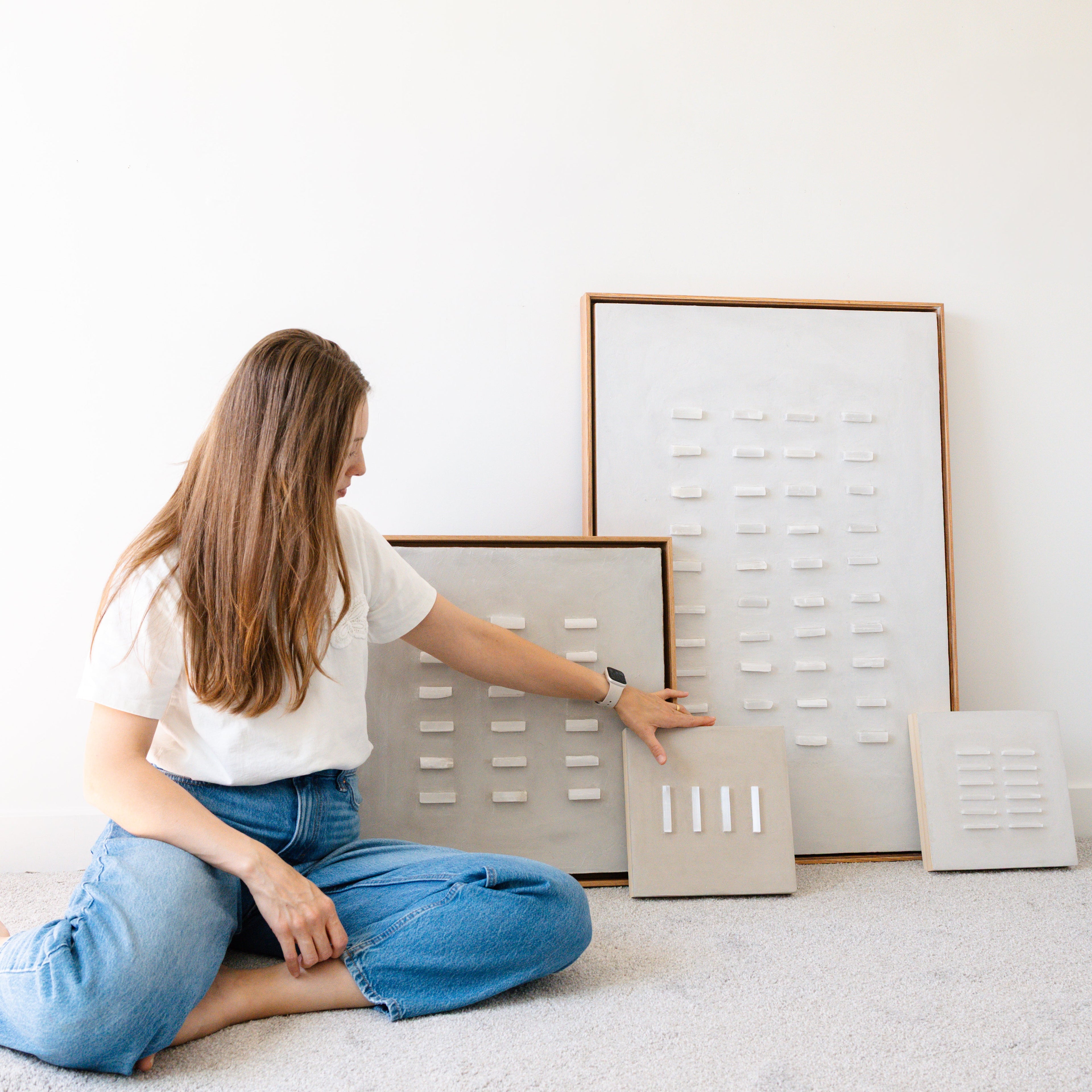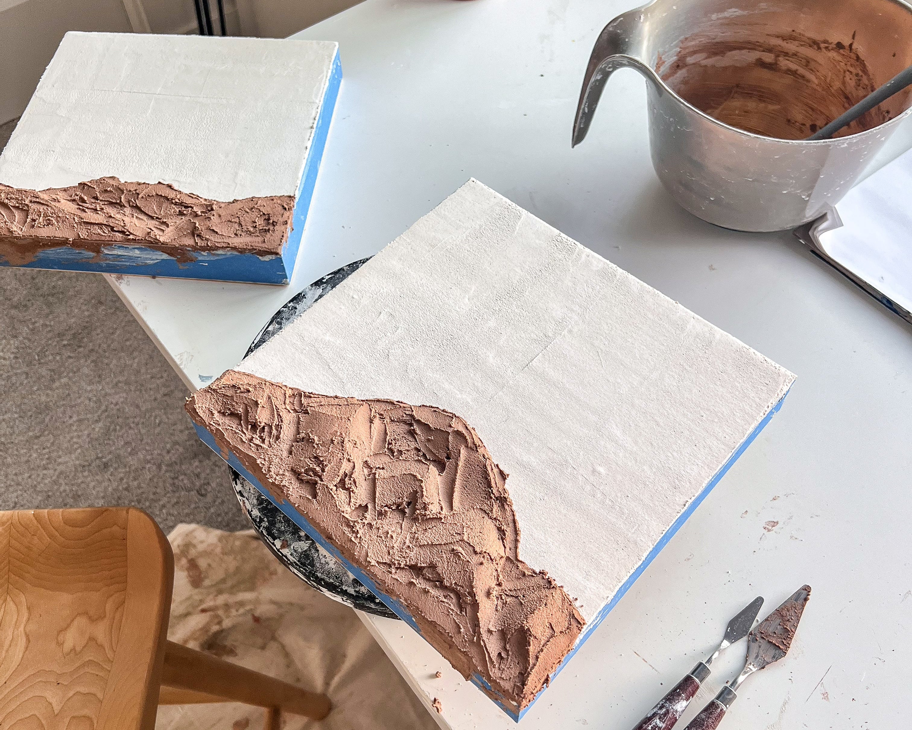 Inspired by my background in architecture, I approach each piece as both structure and spirit. Texture becomes a language of memory; earth pigments recall landscapes of belonging; selenite crystals embody clarity, alignment, and the luminous essence of consciousness. Through slow layering and intentional placement, the work becomes a meditation — a process of revealing, grounding, and refining.