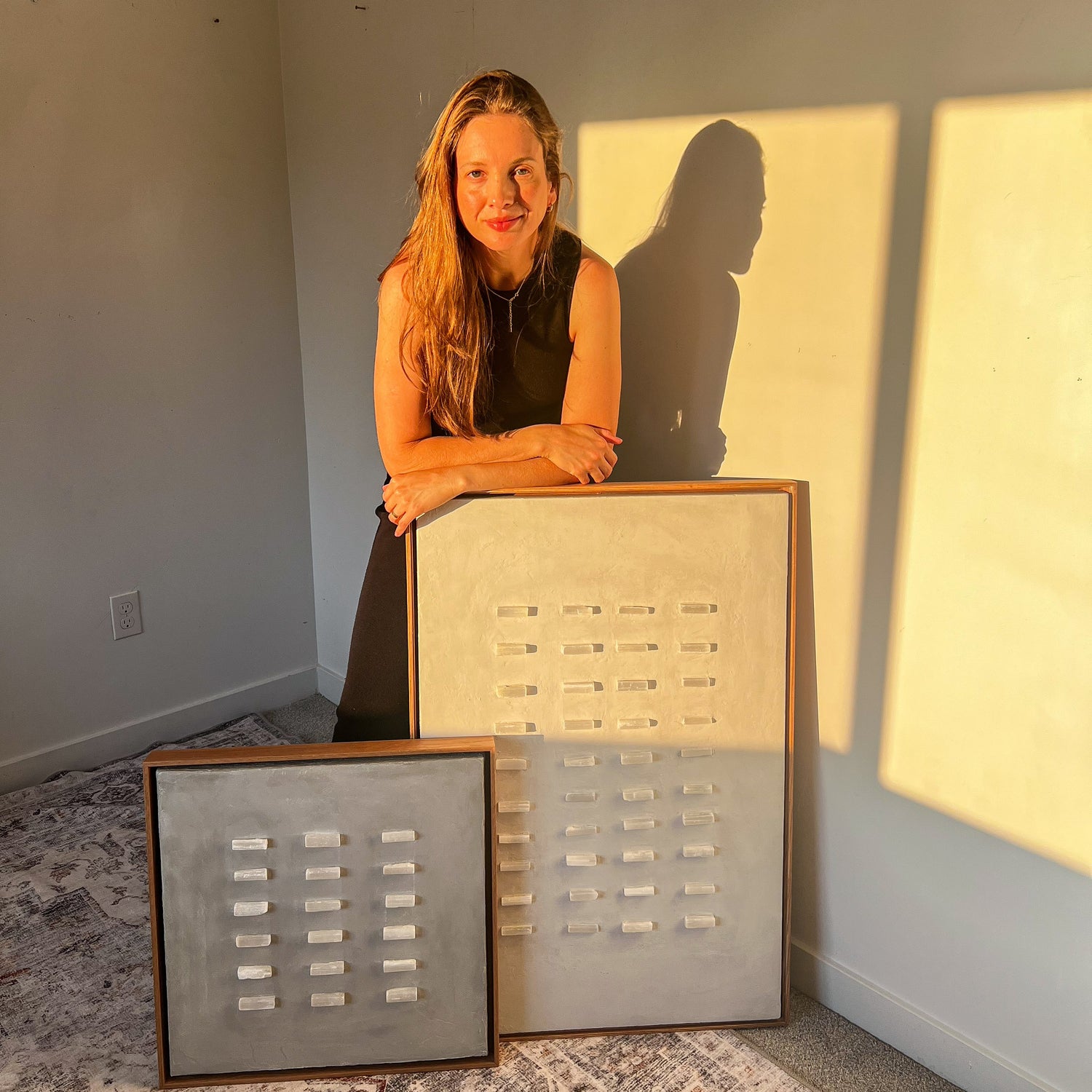 Her sculptural artworks are defined by textured relief, earth pigments, and raw selenite crystals — materials chosen for their grounding, clarifying, and energetic qualities. Influenced by minimalism, natural forms, and architectural structure, her work explores the dialogue between light, form, intention, and the stillness that exists beneath the surface. Each piece is built slowly in layers, honoring both materiality and meaning, creating artworks that feel like portals into spaciousness, harmony, and quiet contemplation.